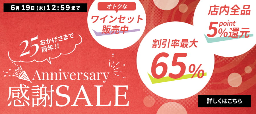 ■【期間限定】6月19日(木) 昼12時59分まで ■25周年記念セール開催中! 25周年を記念して 6月19日(木) 昼12時59分までの期間限定で、 「店内全品ポイント5倍セール」を開催中です! ポイント5倍に加えて、 割引ワインやお得なワインセット、おすすめワイン など、盛りだくさんでご用意しております。 この機会にぜひ、特集ページをご覧ください! ![]()