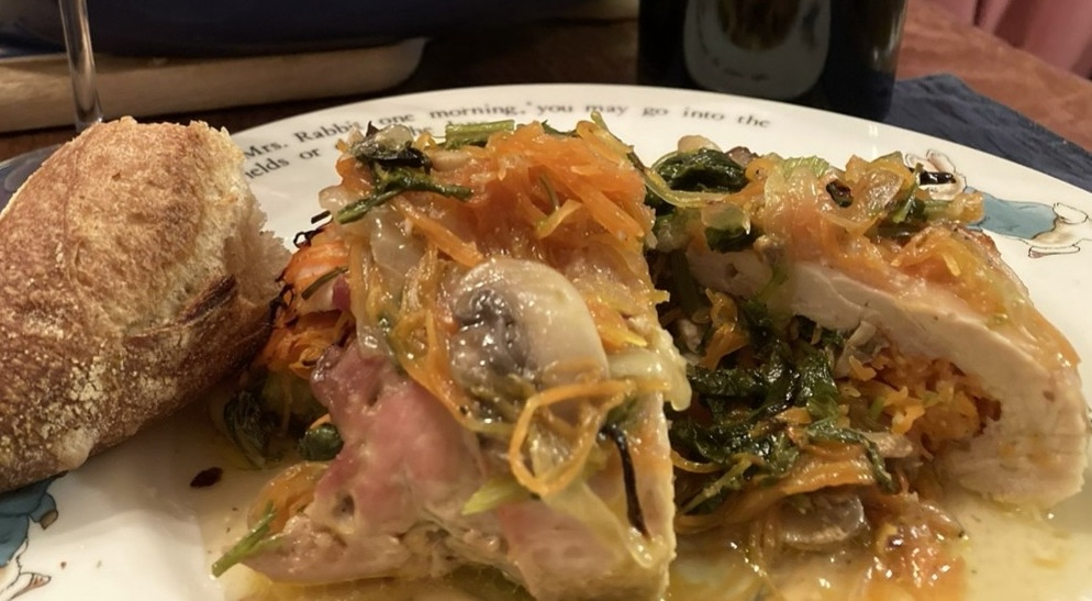 鶏ももに切った野菜を詰めて、